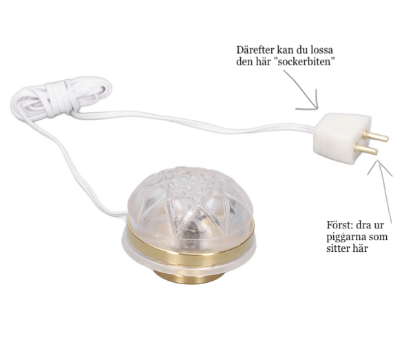 Tillbaka till hur belysningen monteras. Varje EL-lampa har en tillräckligt lång sladd för att man ska kunna dra den bakåt i dockhuset och genom väggen. Den lilla kontakten till lampan är gjord så att du kan dra ut de små piggarna med en liten tång och därefter lossa på ”sockerbiten” och ta av den. Nu har du den ”bara” sladden (som består av två små sladdar med ”koppartråd”. Dessa två trådar snurrar du ihop tillfälligt och stoppar genom hålet i bakväggen. Drar ut den på andra sidan, virar upp trådarna du tillfälligt snurrat ihop, och sätter tillbaka ”sockerbiten” med varsin liten sladdbit i varsitt hål och därefter sätter du tillbaka piggarna. Det är viktigt att piggarna har kontakt med ”koppartråden”. Detta är inte svårt, men det är lite pilligt.