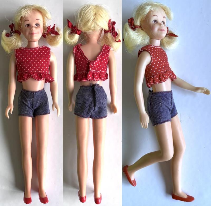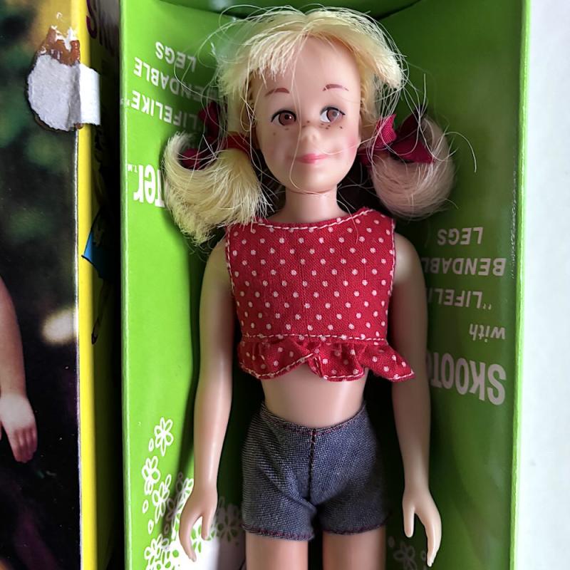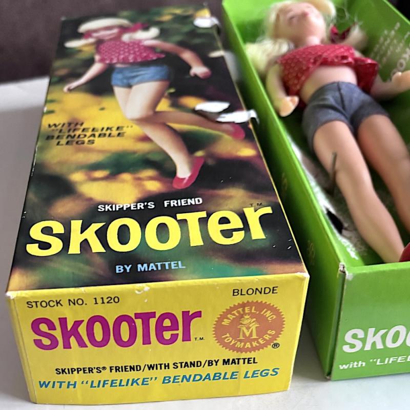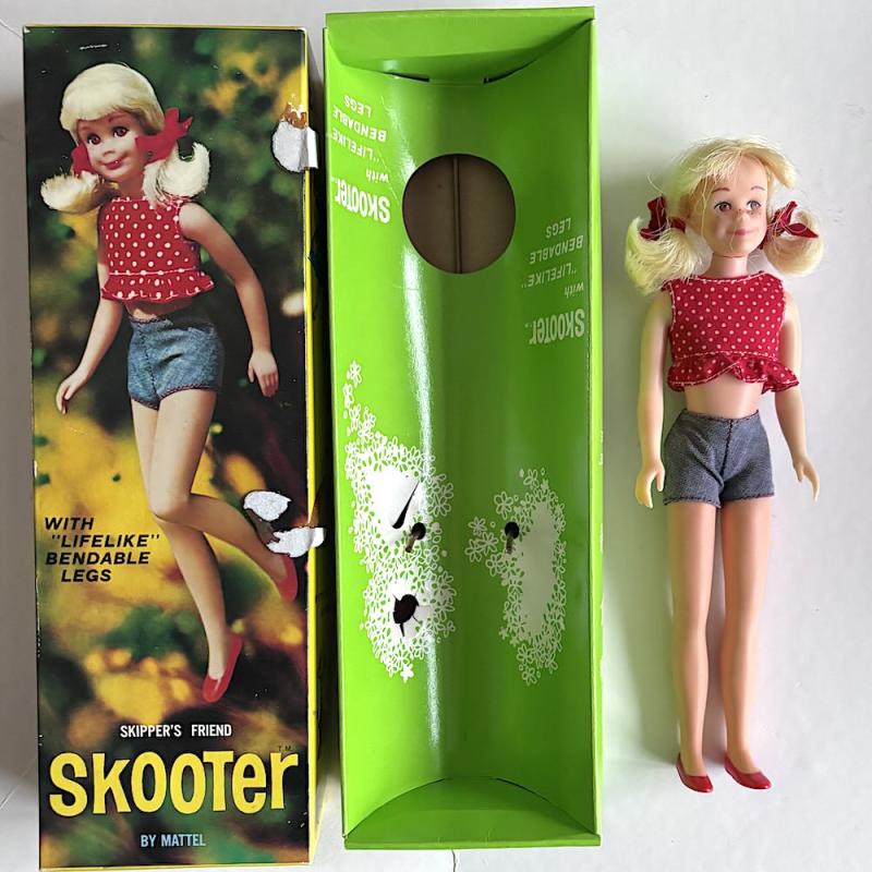Om Skooter: Skippers vän Skooter introducerades 1965 som en straight leg (SL) docka. 1966 började hon produceras som en bend leg (BL) docka. I båda fallen kom hon som brunett, rödhårig eller blondin. Det är mycket ovanligare att hitta en BL Skooter.