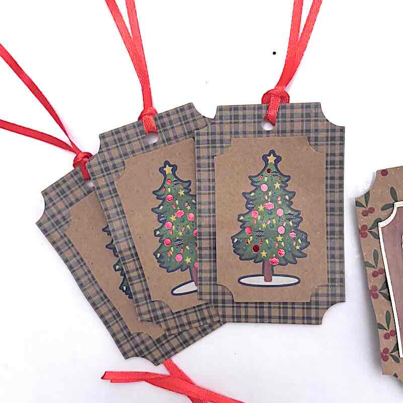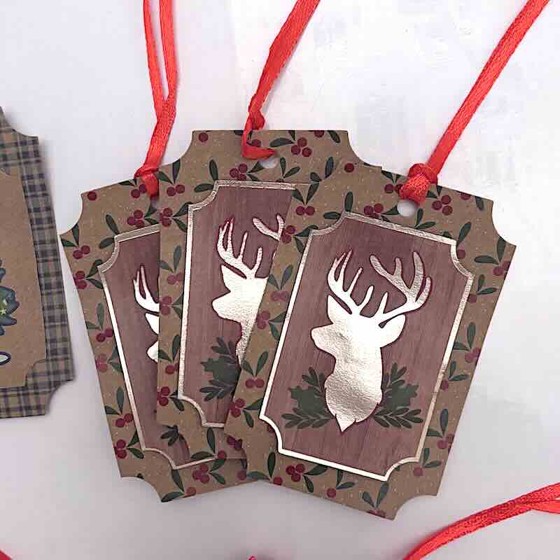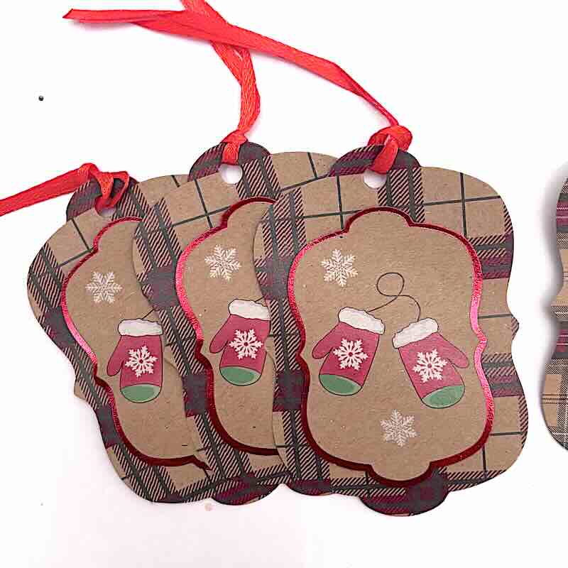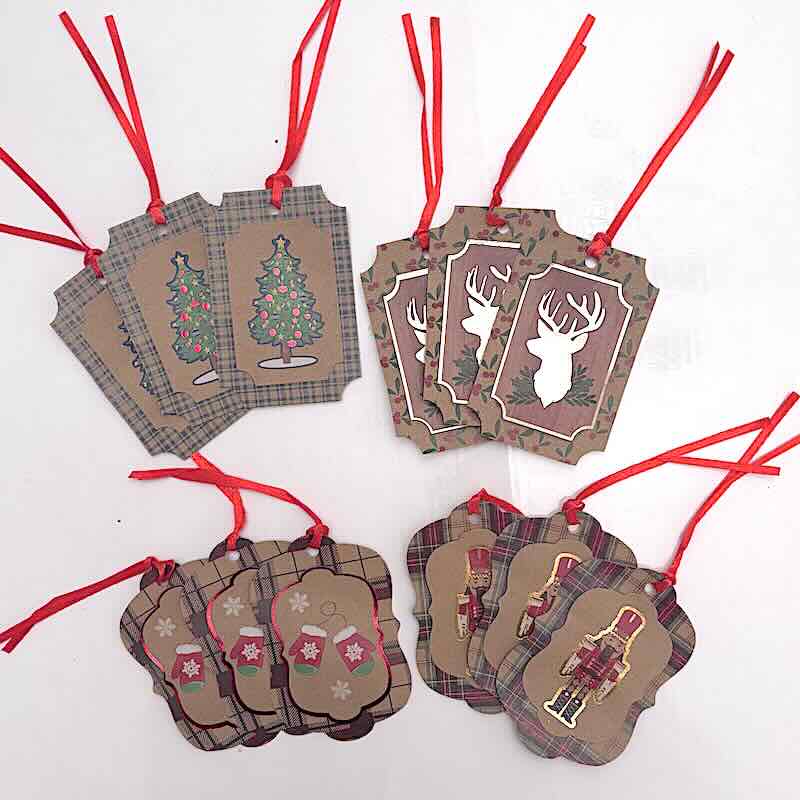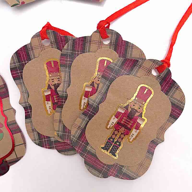 Ett set med tolv stycken fina julklappsetiketter att pryda julklapparna med. De får ett dekorativt och speciellt utseende med dessa vackra etiketter. De är helt tomma på baksidan så du kan skriva din egen god jul-önskan på dem. Tre motiv av varje: Hjort, julgran, vantar och nötknäppare. Mått varje etikett ca 8 cm x 5,5 cm.