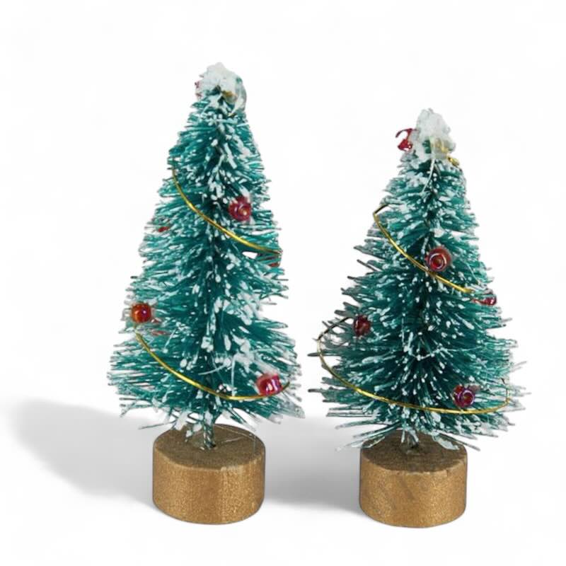 Set med två stycken bords-julgranar för dockhusmiljö och tittskåpsmiljö. Alla granar är lite olika då de är handgjorda. Mått en gran ca H 5 cm.