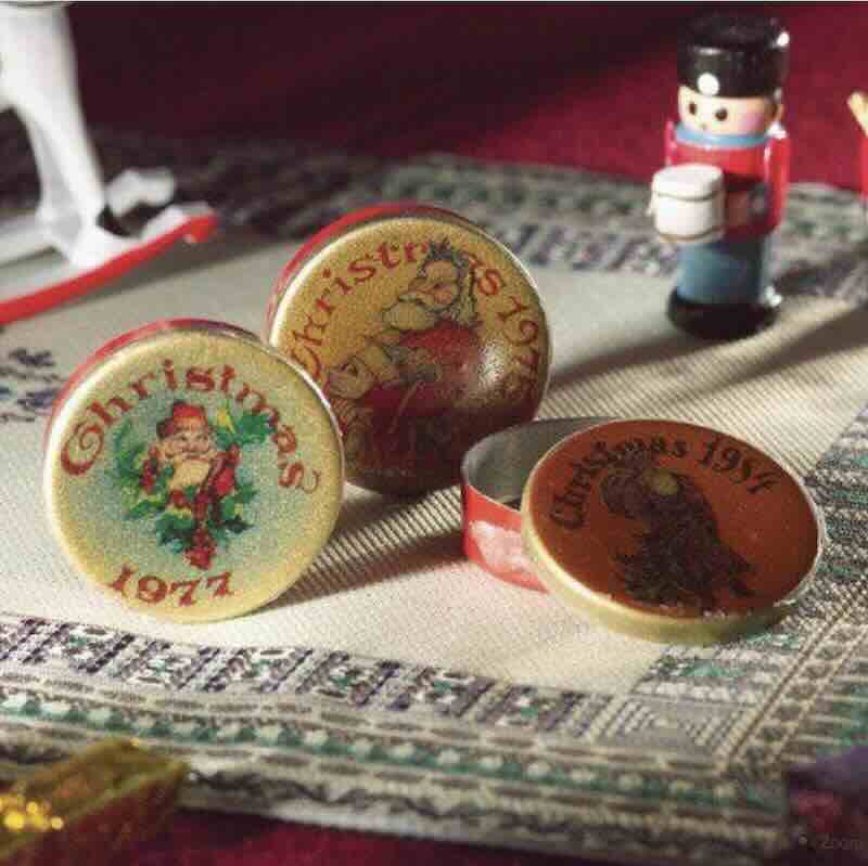 Litet fint julset med tre stycken öppningsbara burkar med olika motiv enligt bild. Mått en burk B 2,5 cm.