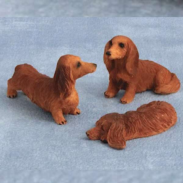 Fint set med tre söta taxar i skala 1:12. TIllverkade i keramisk polyresin och handmålade vilket innebär att alla kan se lite olika ut. Mått ca 3.5cm x 2cm x 6cm.