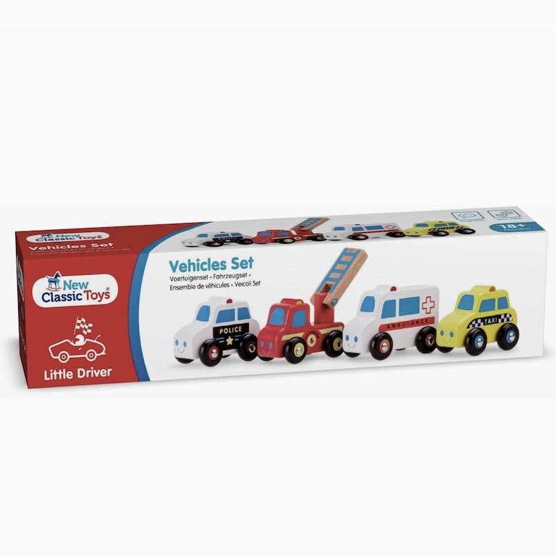 Kvalitetsleksaker i trä från New Classic Toys i Nederländerna: polisbil, brandbil, ambulans och taxi
