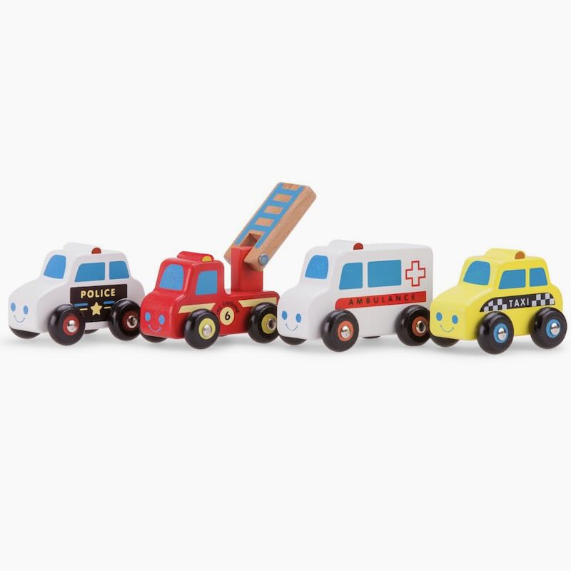 Set med fyra arbetsfordon bilar i trä. Brandbil, polisbil, ambulans och taxi. Passar från 18 mån. Mått ca: L 7cm x B 5,5 x H 6 cm. CE-märkt