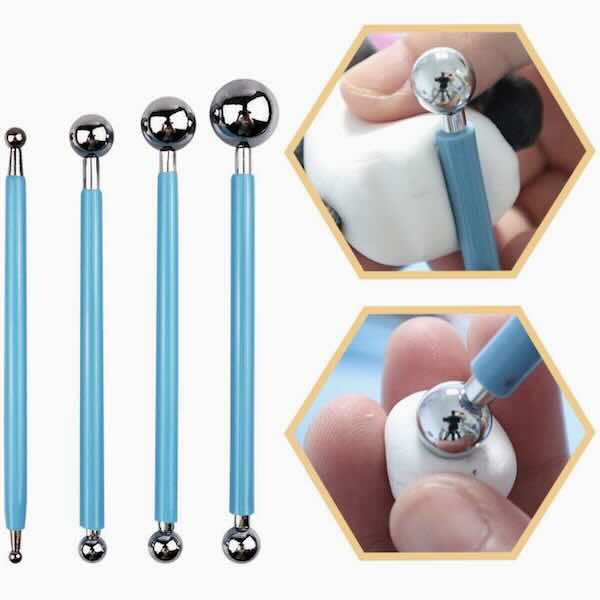 Set med fem stycken små specialverktyg för skulptering av lera, kulformade verktyg. Mått ca L 12,5 cm