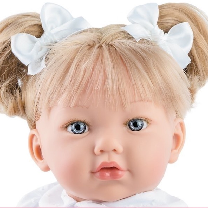 Möt Alina, en naturligt söt docka med handmålade anletsdrag och "riktiga" ögonfranser. Dockan är 45 cm lång. Hon har huvud, armar och ben i vinyl och en mjuk tygkropp att krama. Hennes ansikte är bedårande och hon har på sig en väldigt söt outfit med klänning, byxor, mjuka skor och hårband. Passr från ålder 3 år. Dockan kommer i fin presentförpackning.
