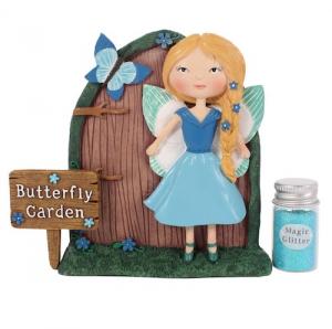 Älvan Amelia står vid dörren till sin fjärilsträdgård med en skylt och liten glasflaska med glittermagi. Lika fin utomhus som på barnrummet. Tillverkad i handmålad keramisk polyresin. Passar från 3 år pga smådelar. Mått ca H: 15cm x B: 18cm x D: 5cm. Kommer i fin presentask.