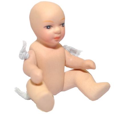Söt liten baby i porslin att göra kläder till. Mått ca L 4,5 cm. Dockan har et hål i skrevet efter tillverkningen där man fäst gummibanden inuti dockan. Ingen leksak utan ett samlarobjekt