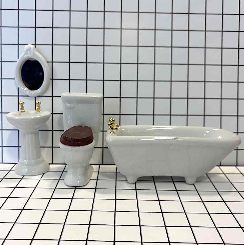 Badrum toalett, badkar, handfat, spegel, 4 delar porslin