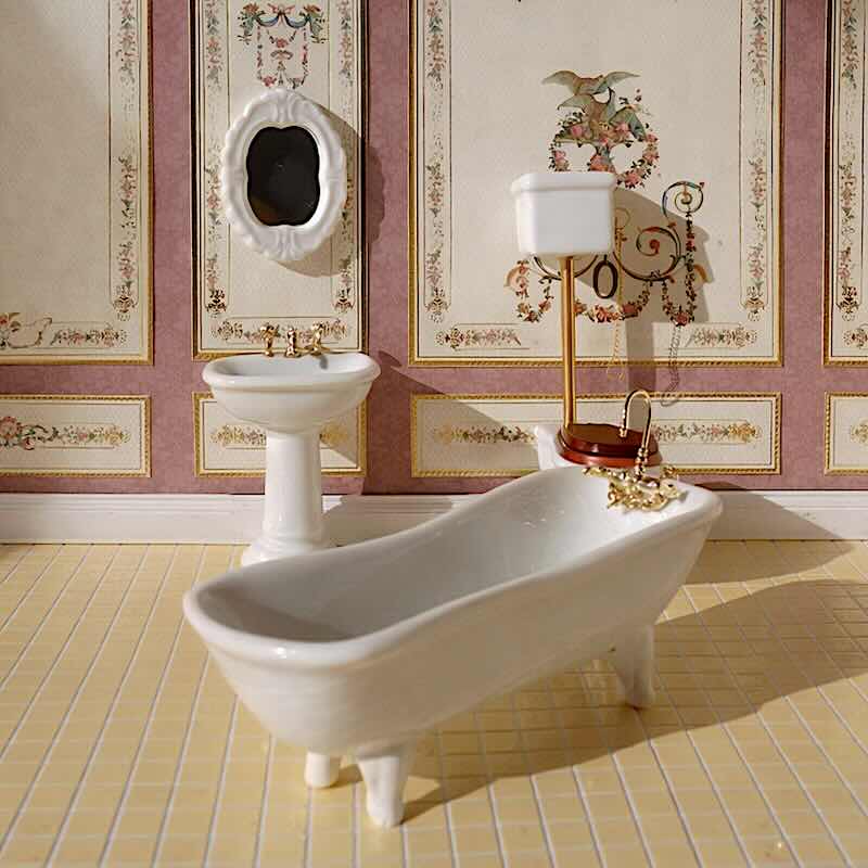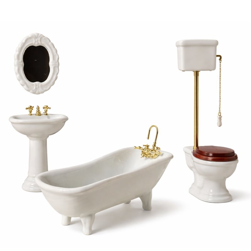 Ett badrumsset i porslin med toalett, badkar med guldkran, spegel och handfat. Mått ca 13 x 13,5 x 0,5 cm