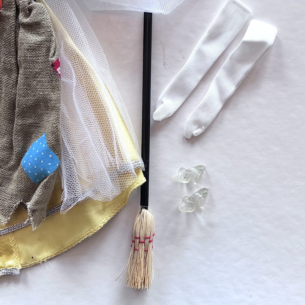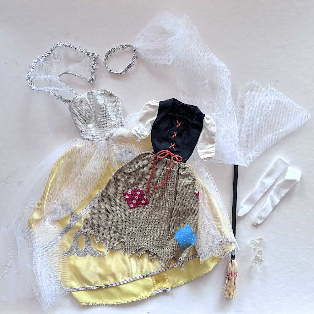 Barbie #0872 Cinderella från 1964-1965 med vacker balklänning, långa vita handskar, genomskinliga glittriga skor och tillhörande tiara/slöja + Askungens lappade klänning och kvast i mycket fint lekt skick. Det enda som saknas är det lilla reklambladet, för övrigt komplett.