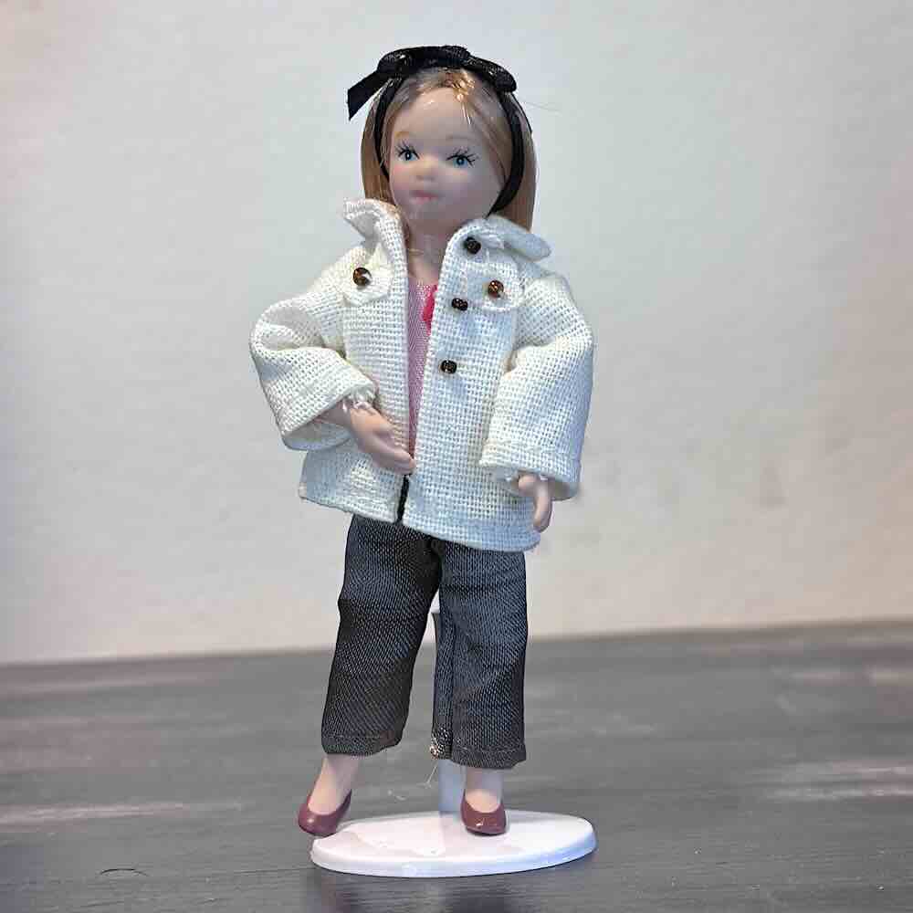 Söt docka i porslin med böjbara leder vid armbåge och knä. Kommer med ställ. Mått ca 10,5 cm.