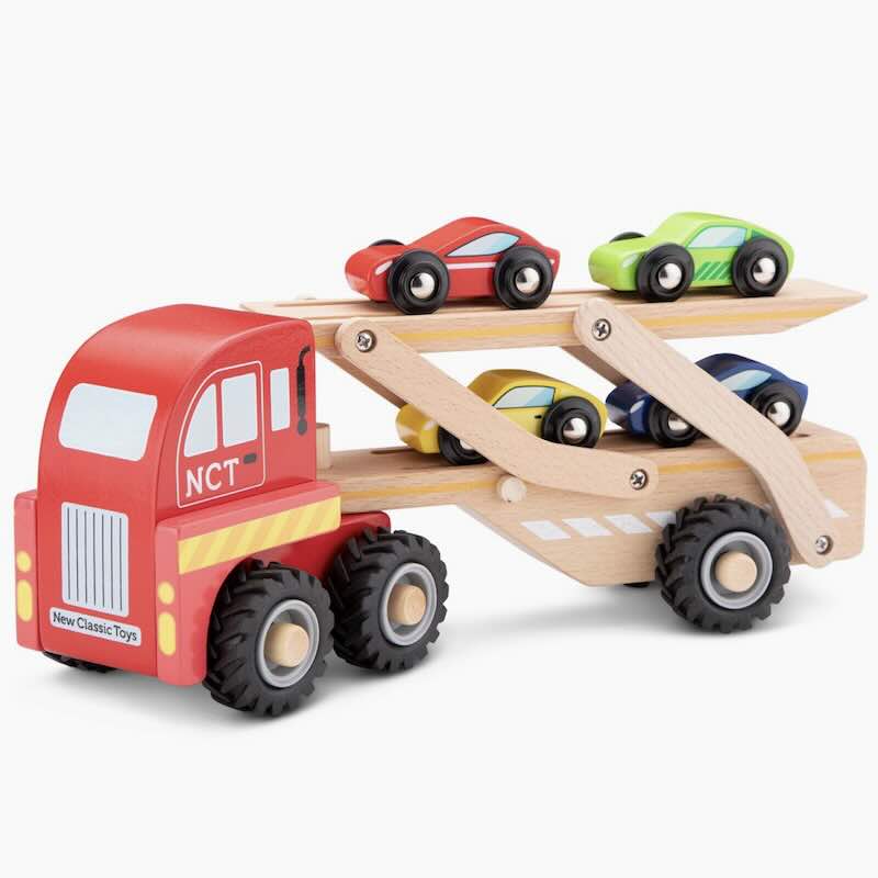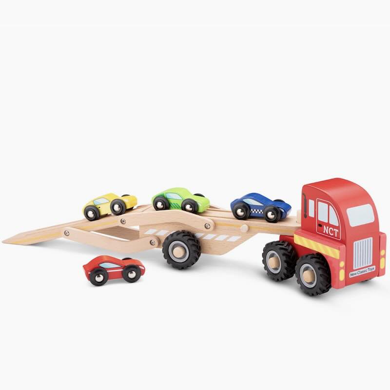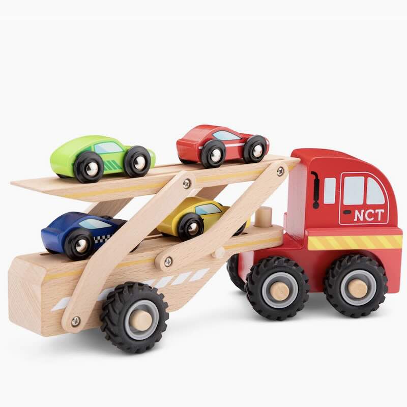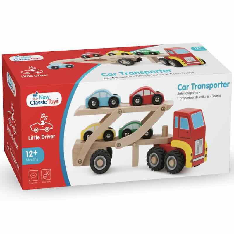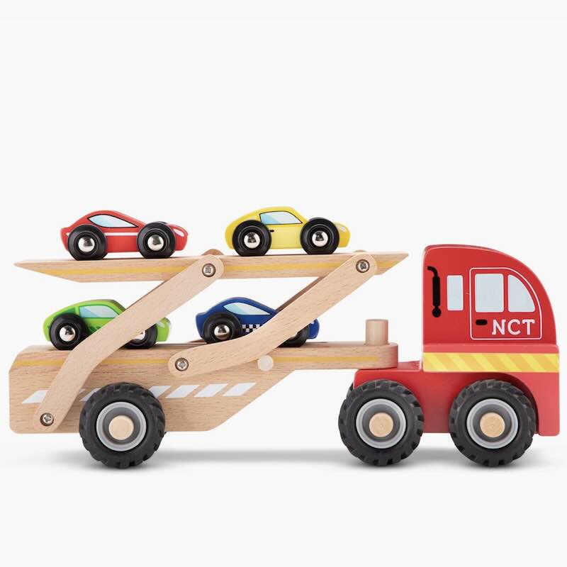Cool biltransport i trä med fyra bilar. Översta våningen kan höjas och sänkas ner, så att bilarna enkelt kan köra upp och ner på biltransporten. Själva vagnsdelen kan kopplas bort från lastbilen. Du får med biltransporten och fyra bilar. Tillverkad i bokträ. Passar från 18 mån. Mått ca: L 28 x B 8,5 x H 11 cm. CE-märkt