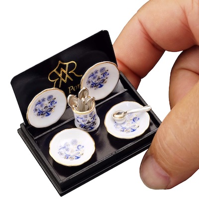 Fantastiskt fint set med fyra tallrikar, skedar och bestickförvaring i serien blue onion med blått mönster och äkta guldkant. Du får delar enligt bilden. Tillverkat i porslin och skedar i metall. Kommer i fin skyddande presentask enligt bild.
