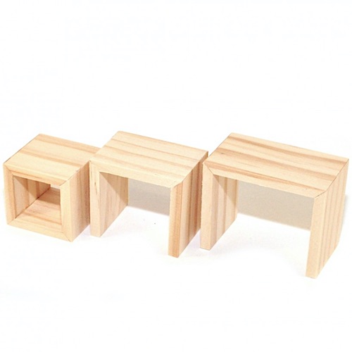 Ett litet set med tre små bord som du kan placera som du vill. Tillverkade i obehandlat trä. Mått ca stora bordet 6.1cm x 4.8. Mellan: 4.9cm x 4.1cm. Lilla: 3.8cm x 3.6cm. Välj själv om du vill måla dem, lacka dem eller ha dem som de är.