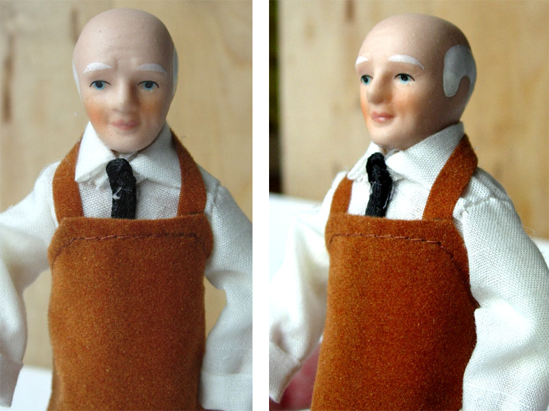 Äldre butiksägare i porslin med skjorta, slips, randiga byxor och förkläde. Böjbara armar och ben. Mått ca 15,5 cm. I nyskick.