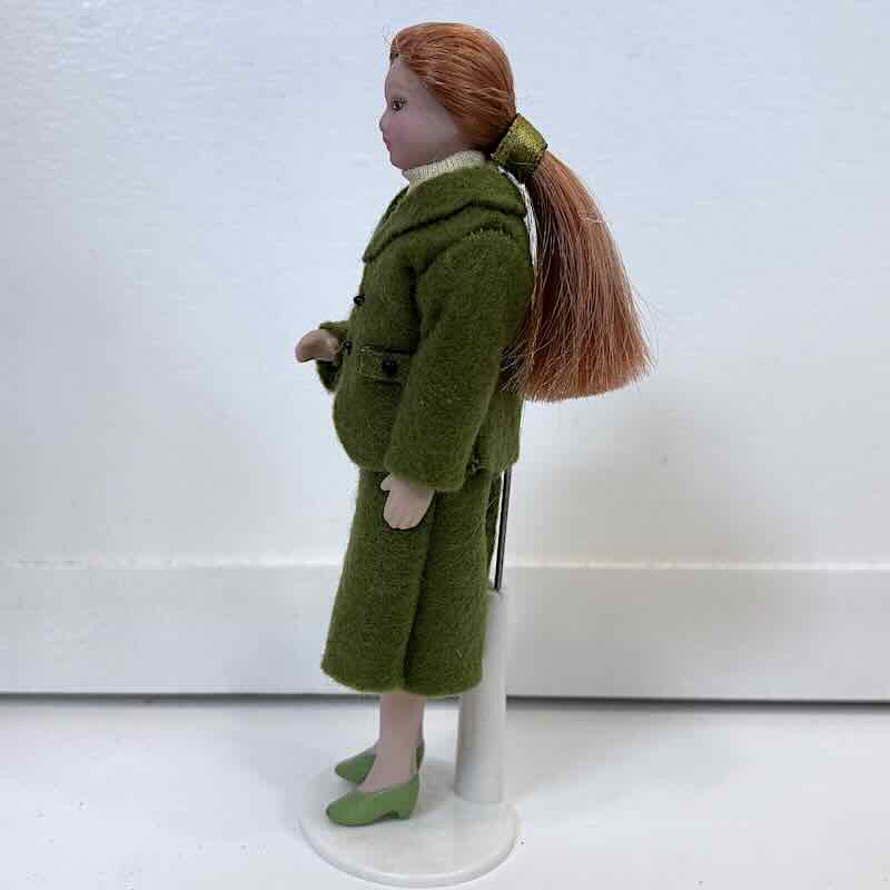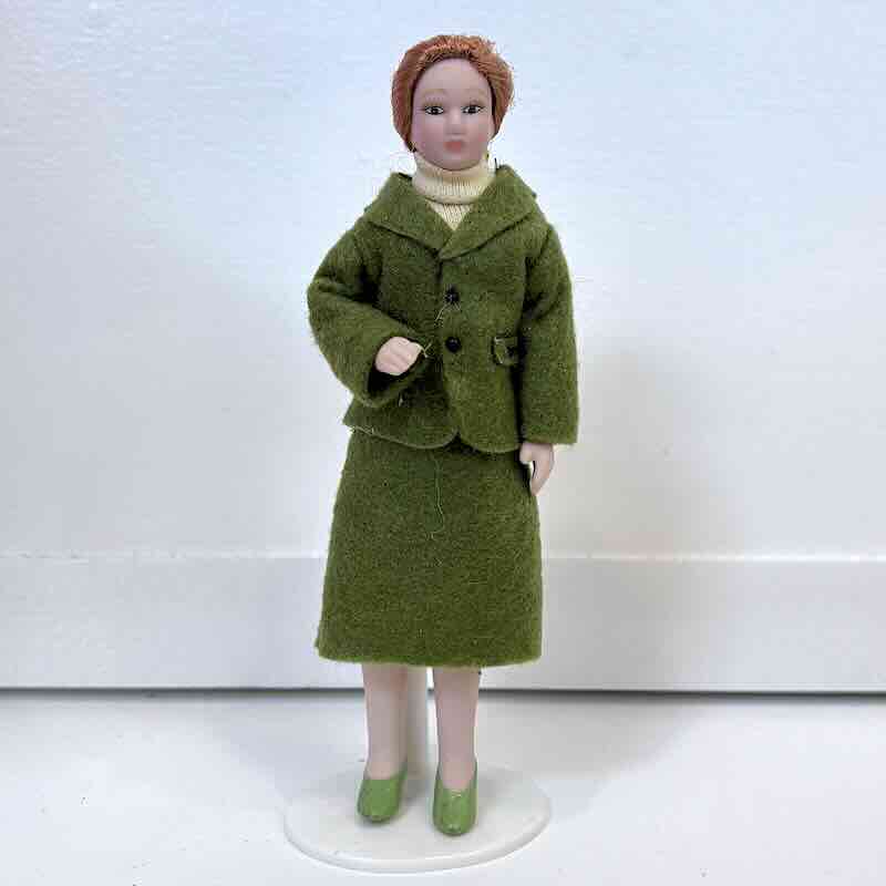 Dockhusdocka kvinna i porslin med böjbara armar och ben. Klädd i grönt set. Hon har långt rödblont hår uppsatt i tofs. Kommer inklusive ställ. Mått ca L 14,5 cm