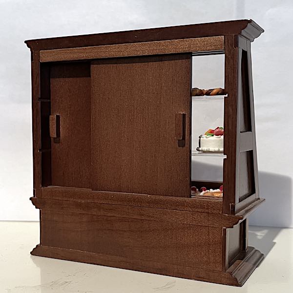 Butiksdisk med glasruta (plexi) fram och skjutdörrar bak, två hyllplan att placera bakverk, bröd, tårtor eller maträtter på. Tillverkad i mahogny-lackerat trä med hyllplan och framsida i plexiglas. Mått ca 11.8 cm x 12 cm x 5 cm. Bakverken på bilden ingår ej.
