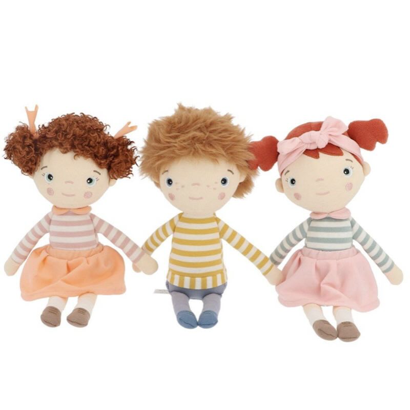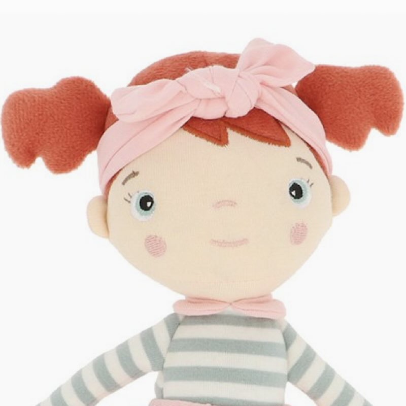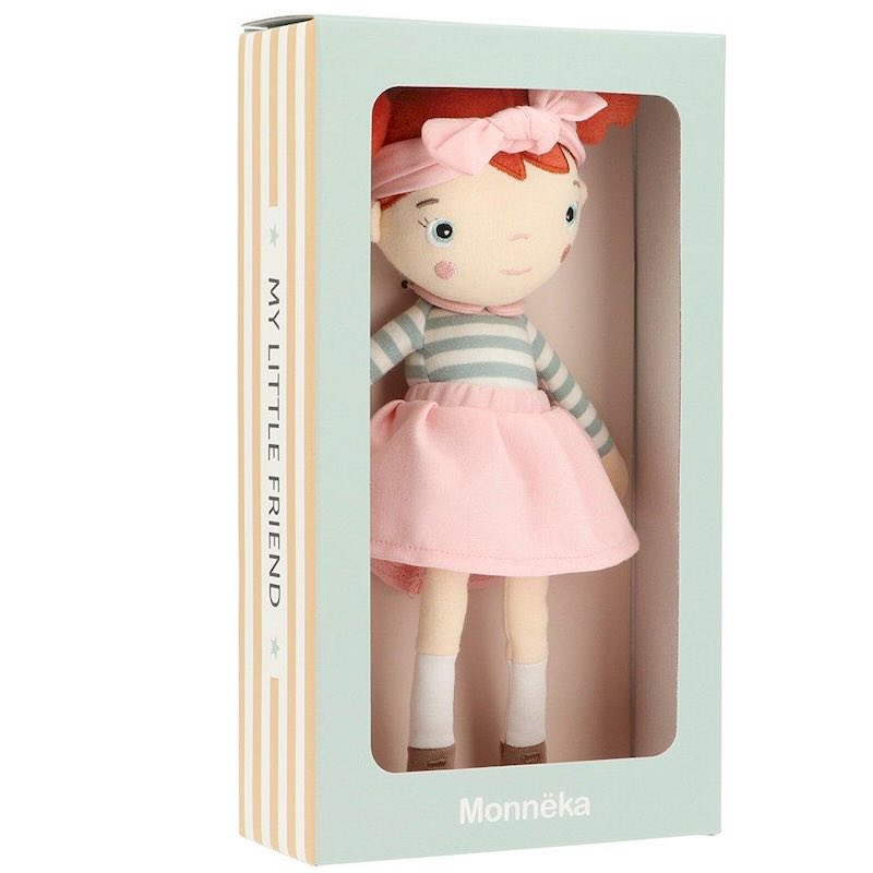 Monnëka docka Mia: Busiga och charmiga dockan Mia är en mycket kramgo kompis som passar från nyfödd till 1-2 år. Kroppen är av 100% bomull med hår i polyesterblandning. Hon är klädd i randig fastsydd tröja och avtagbar kjol. Mått ca L 30 cm. CE-märkt och uppfyller alla säkerhetskrav.