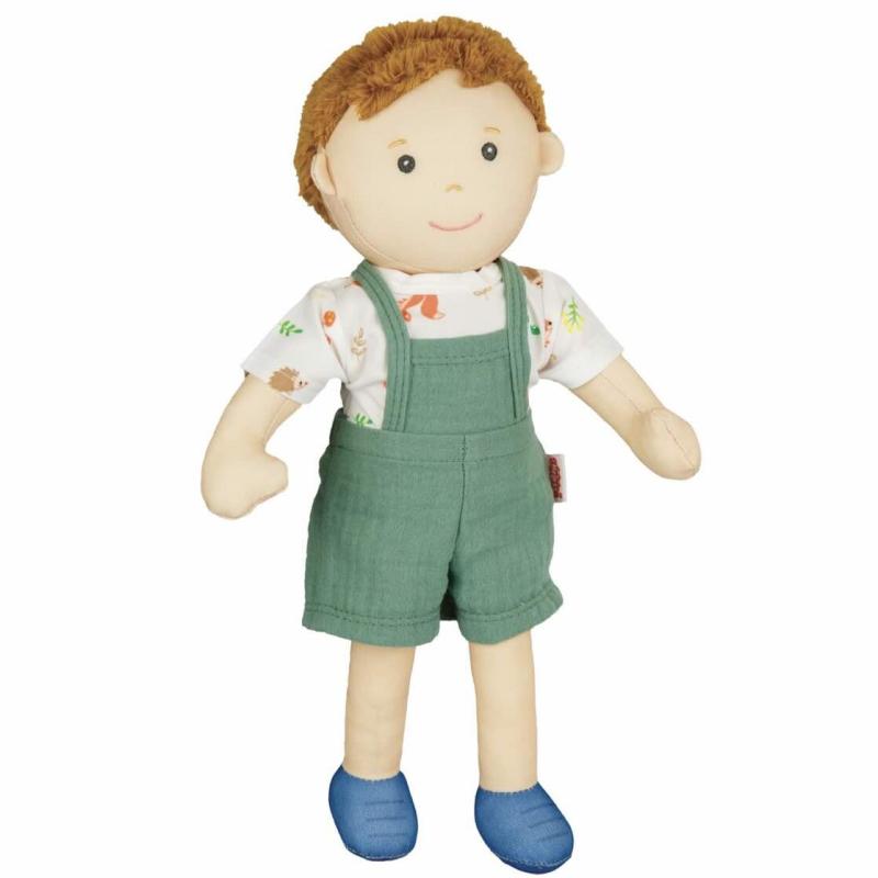 Paul har på sig en cool outfit, bestående av en T-shirt och hängselbyxor av ekologisk bomull. Båda har kardborreknäppning, vilket gör dem lätta att ta på och av. Alla andra outfits från Heless dockklädsortiment (28-35 cm) och skorna (30-34 cm) passar honom också perfekt.