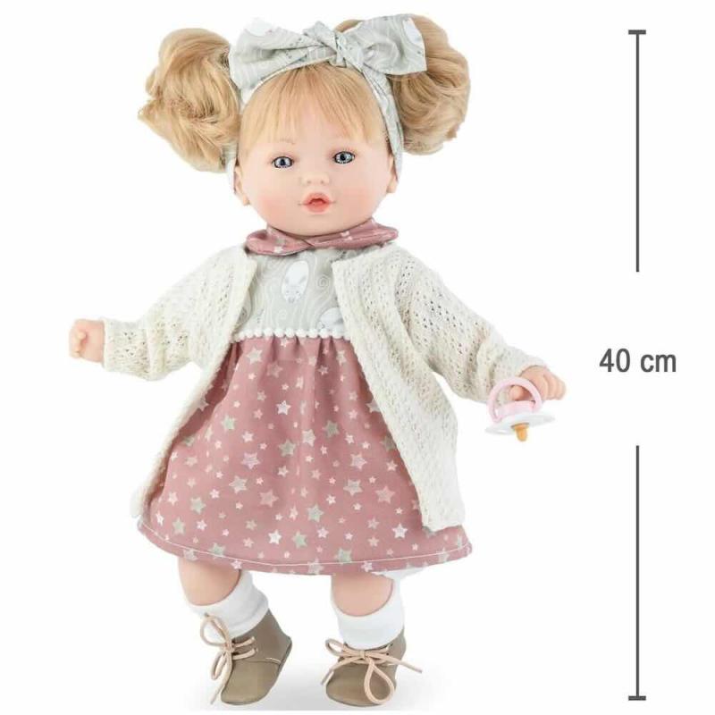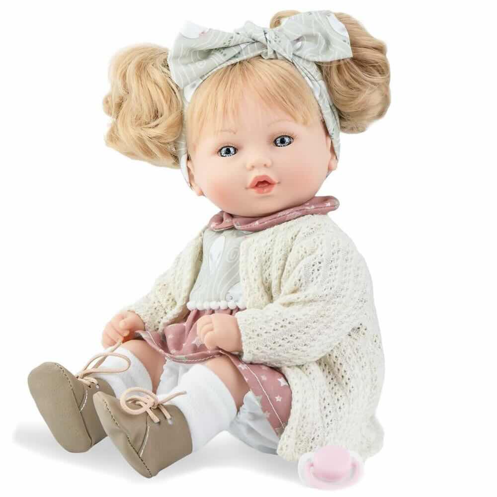 Mycket fin och välgjord docka med vackra och detaljerade anletsdrag och lite längre ljust hår. Iklädd de vackra kläderna på bilden. Dockans mått är H 40 cm. Dockans vinyl kan rengöras med en fuktad trasa. Använd inte babyservetter som kan innehålla alkohol vilket kan skada vinylen. Dockan är tillverkad i Spanien, CE-märkt och passar från 3 år. Kommer i vacker presentkartong.