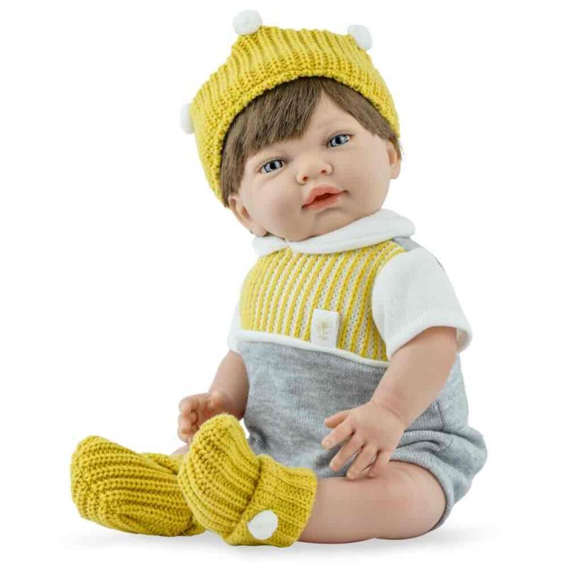 Charmig docka med brunt hår, blågrå ögon med ögonfransar, och klädd i gula, gråa och vita kläder. Du väljer själv om du vill att det ska vara en flicka eller pojke. Dockan har mjuk kropp, Klädd i plaggen på bilden: strumpor, lekdräkt, jacka, mössa. Mått ca L 42 cm. Dockan kommer i en fin presentförpackning.
