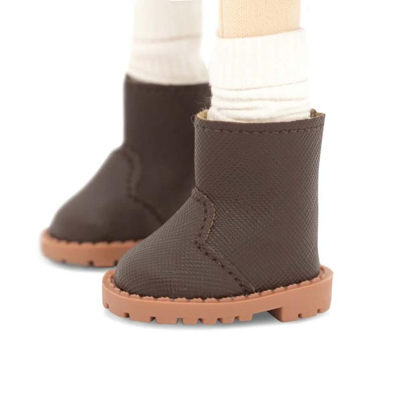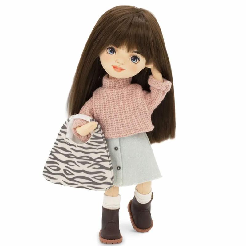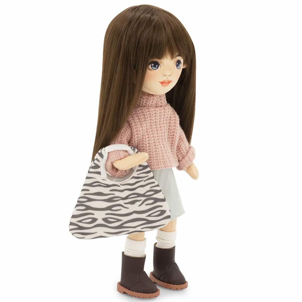 Sophie är klädd i en mysig stickad tröja, en ljusgrå denimkjol med knappslå, vita strumpor och mörkbruna stövlar. Hennes outfit kompletteras av en zebrarandig handväska. Både kläder och skor kan tas av och passar alla dockor i serien.