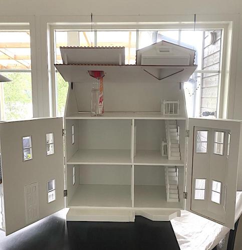 Det vackra dockhuset Romantica/Isabel i skala 1:12. Ett trevåningshus varav ett vindsrum (totalt 5 rum och två trappor), två luckor att öppna fram. Vitlackerade innerväggar och ytterväggar och rödbrunt tak. Mått ca h 72 cm x b 62 cm x d 41 cm. Höjd ett vanligt rum 23 cm.