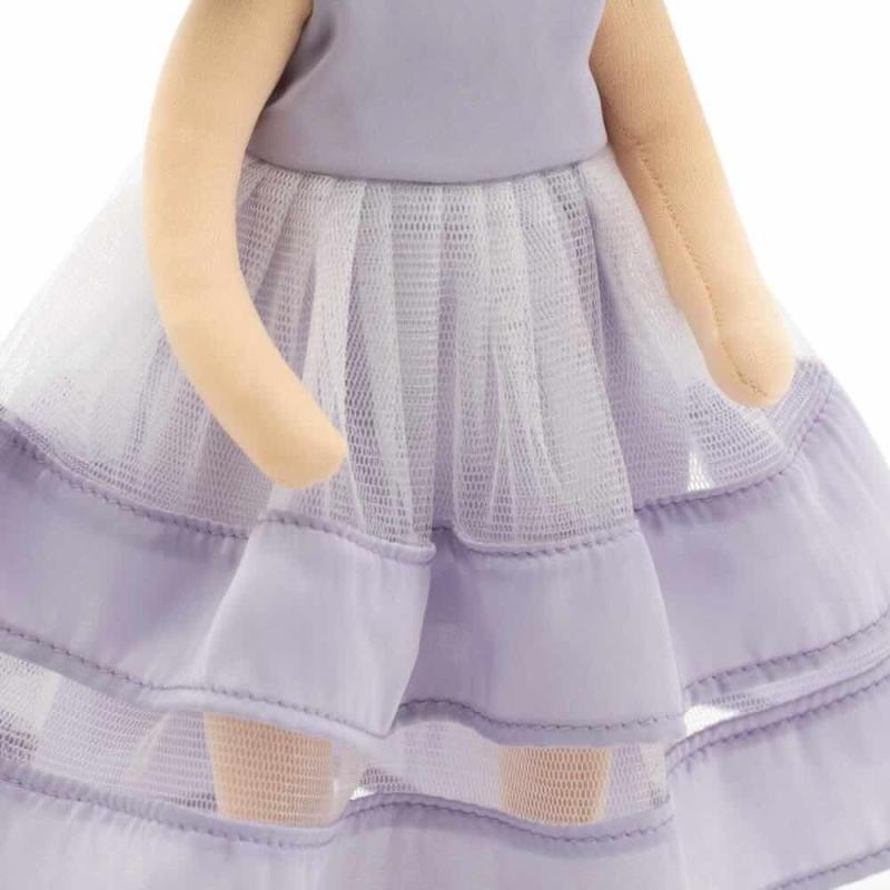 Mycket snygg finklänning i lila blank textil med detaljer i tyll och tillhörande hårspänne, till Sweet sisters dockor. Enkel att klä på och av. Handtvätt 30°, ska ej strykas eller torktumlas.