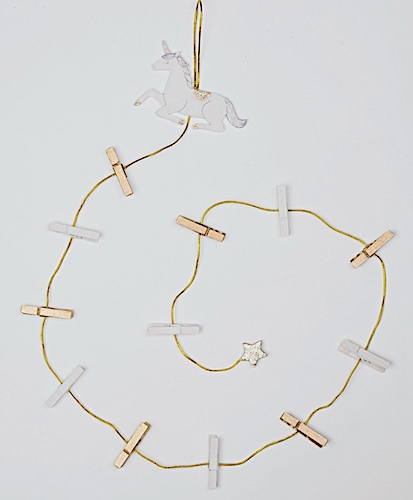 Enhörning kort-/teckningshållare – söt detaljerad enhörning i målat trä med små klädnypor (i trä) på ett guldfärgat band – som du kan hänga teckningar eller kort på. Enkelt för barnen själva att sätta upp nya teckningar och bilder. Längd 119 cm.