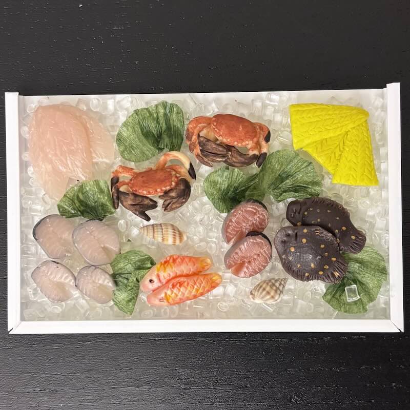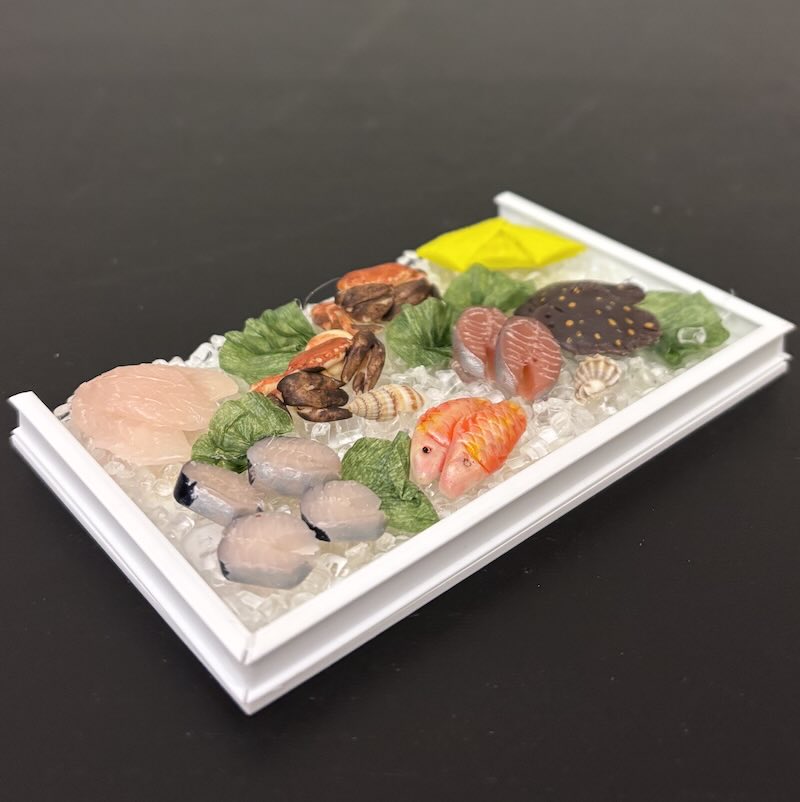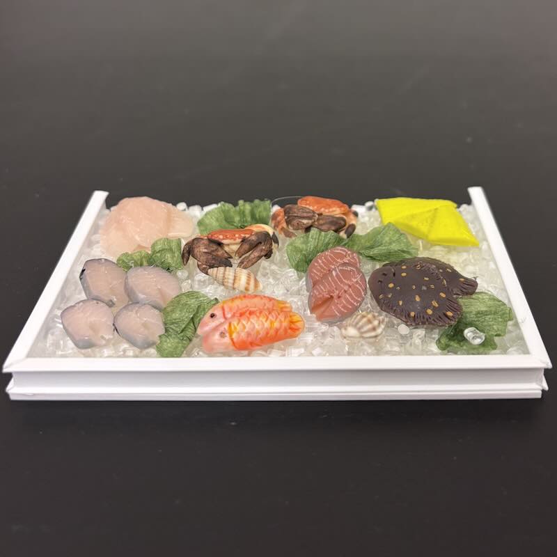 En mycket fin, detaljrik och välgjord display av fisk och skaldjur. Handgjorda och målade fiskar och skaldjur enligt bild. Alla delar sitter fast på botten. Mått själva displayen är 10 x 6,3 cm.