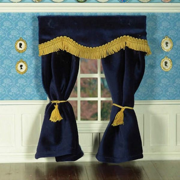 Mycket dekorativa gardiner i mörkblå sammet med gulddetaljer enligt bild, för 1 fönster. Mått ca L 17 cm x 14 cm.