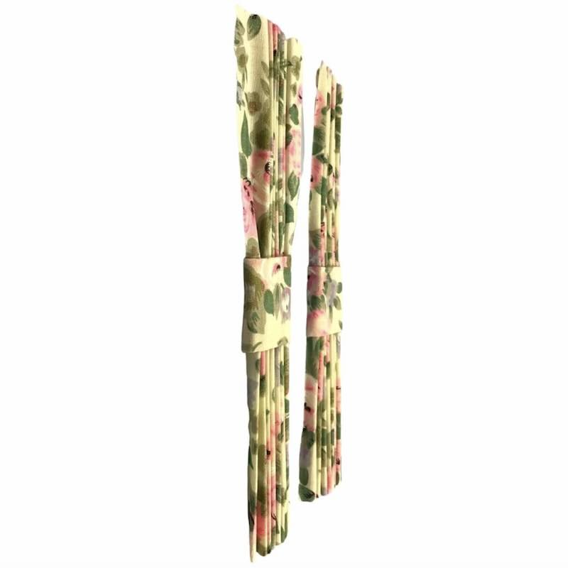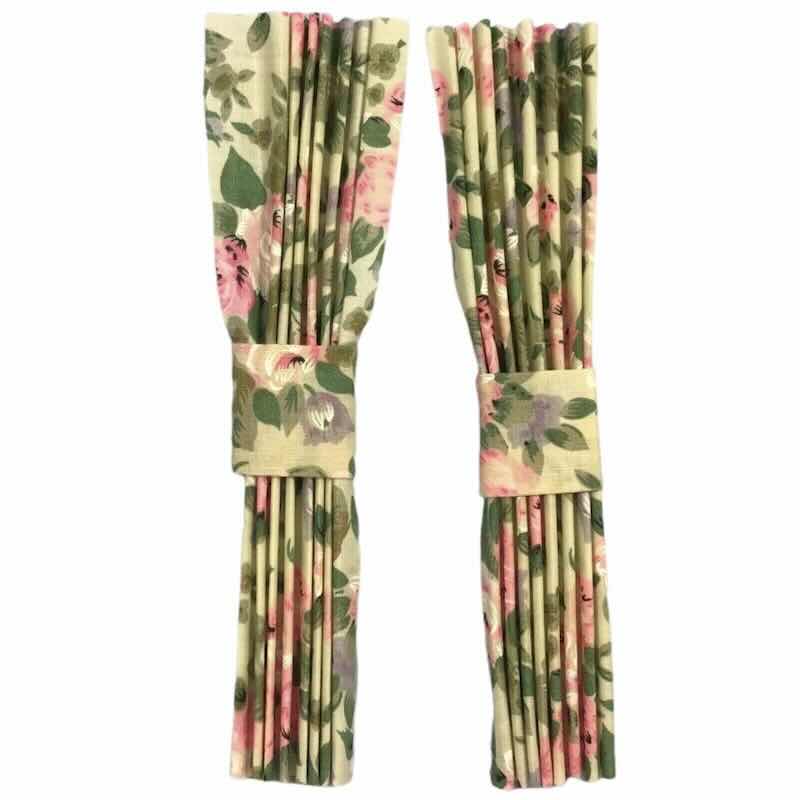 Ett par snygga gardiner för dockhus och tittskåp. Gardinerna är veckade (behandlad textil) och med band som bilden visar. Du limmar eller syr fast dem på gardinstången. Mått ca L 18,5 cm.