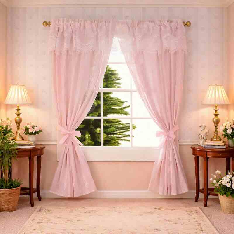 Rosa gardiner med spetsdetaljer för ett fönster. Mått ca H 18 cm x B 12 cm.