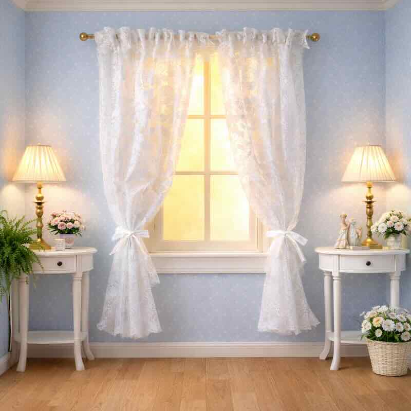Ett par vita spetsgardiner till ett fönster. Mått ca H 15,5 cm x B 12 cm.