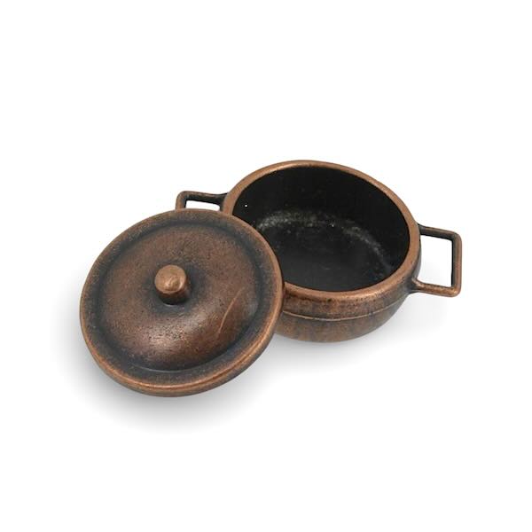 En stilren gryta i bronsfärgad metall med avtagbart lock. Mått inkl handtag ca B 3,4 cm x H inkl lock ca 1,8 cm