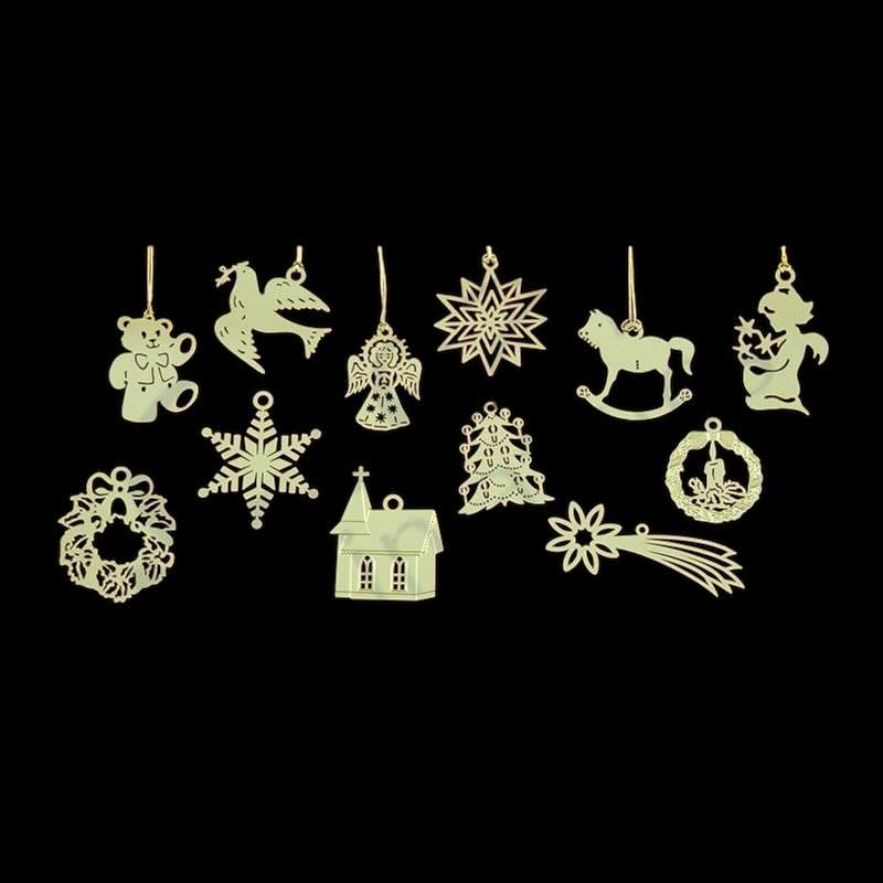 Fint set med julgransdekor/juldekor i i tunn guldfärgad metall, mått per dekordel ca 2 cm.