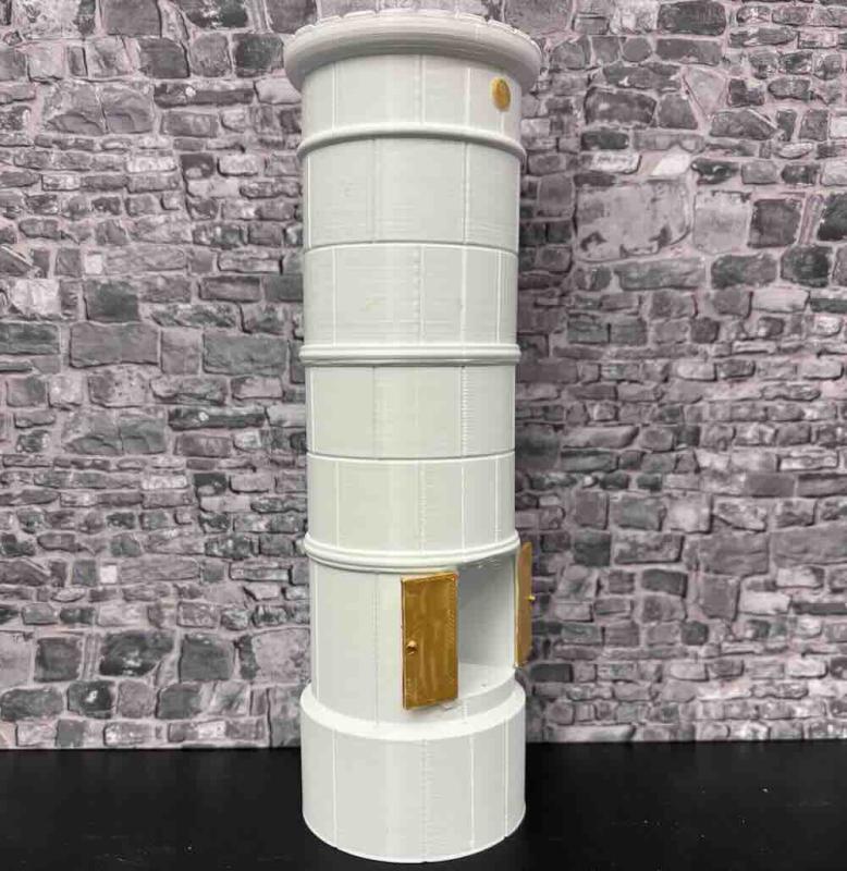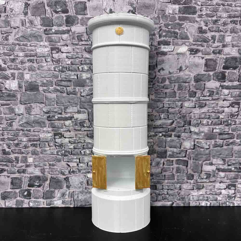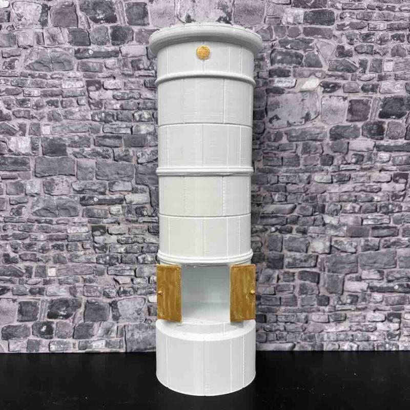 En stilfull kakelugn i klassisk svensk stil med fasta luckor (sitter fast mot kakelugnen och är dekoration). Designad av Dockbutiken och 3D-printad i hårt plastmaterial. Höjd 20 cm. Kan målas med oljebaserad hobbyfärg eller behållas som den är. Detaljer målade i mässingsfärg.