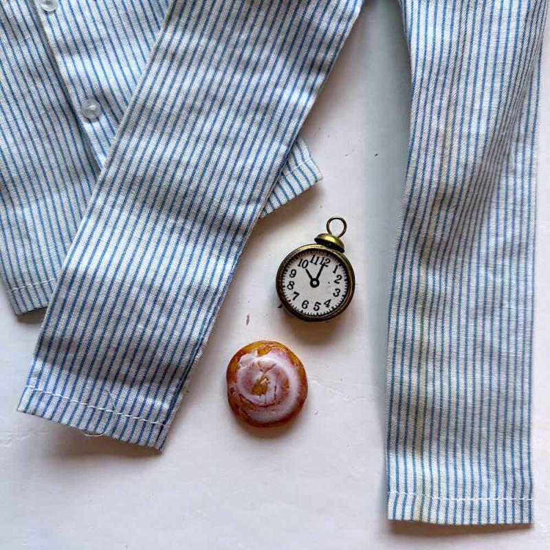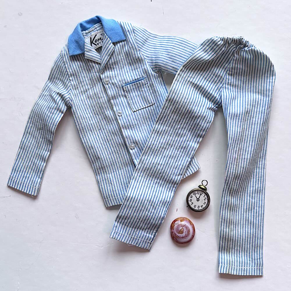 Blåvitrandig pyamas, väckarklocka och bulle i setet Ken #0781 Sleeper set från 1964, nästan komplett och i mycket fint skick.