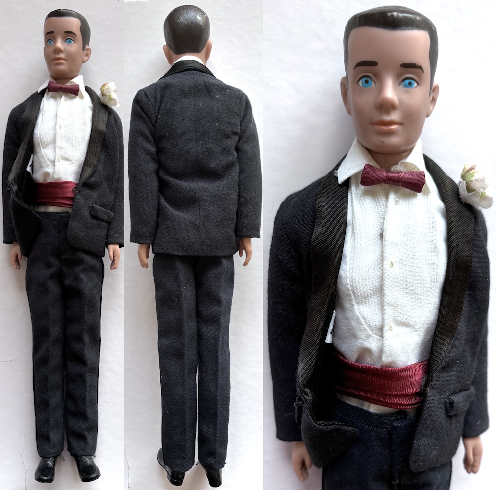Stilige Ken #750 SL brunett från 1962-1965 klädd i #787 Tuxedo från 1961-65, komplett och i fint lekt skick, lättare ytsmuts. Ken med mkt litet skav i luggen och på ena sidan, fin ansiktsmålning. Kläderna består av smokingskjorta, fluga, gördel, smokingkavaj och byxor, svarta strumpor och svarta skor märkta Japan, corsage fäst i kavajen (blomma t Barbie). Resåren uttänjd i gördeln. Corsage mycket svår att hitta.