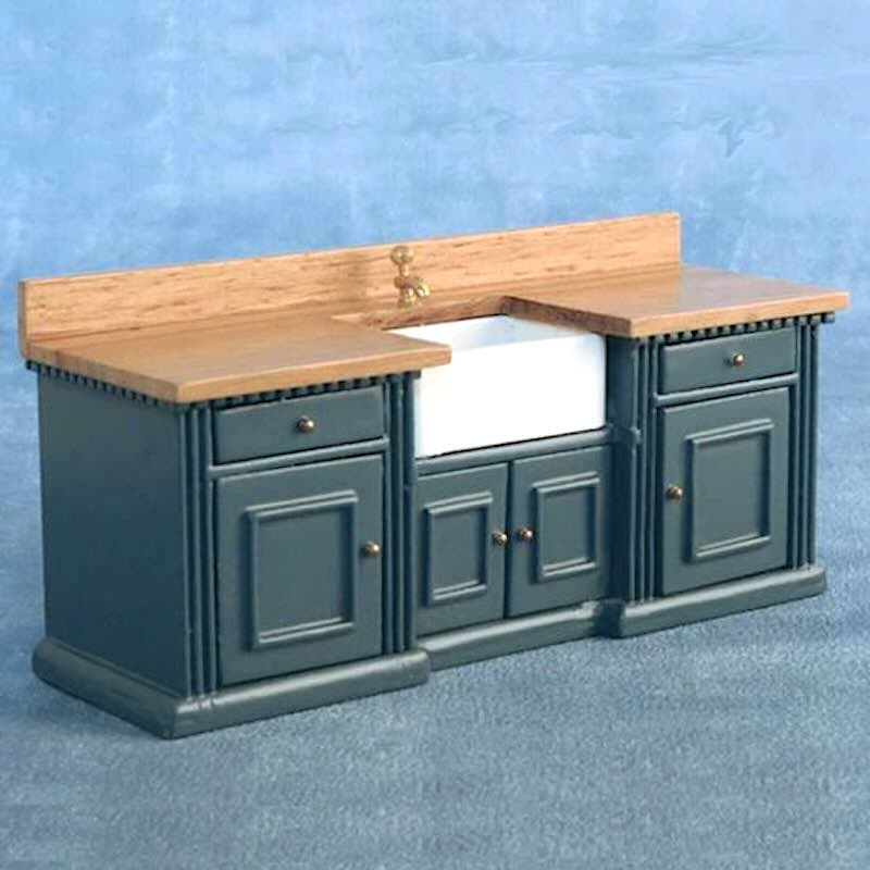 Mycket fint detaljerad diskbänk/köksbänk/badrumskommod i blå-lackerat trä och träfärg, med handfat i vitt och kranar i guld. Öppningsbara luckor o lådor. Mått ca L 150mm x D 53mm x H 70mm