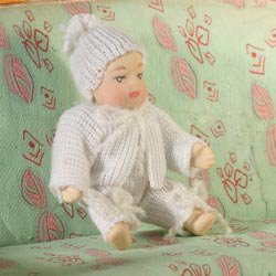 Lilla babyn Lily-Mae i vita kläder. Hon är helt i porslin och har rörliga axelleder och benleder så att hon kan sitta. Mått ca 4,5 cm