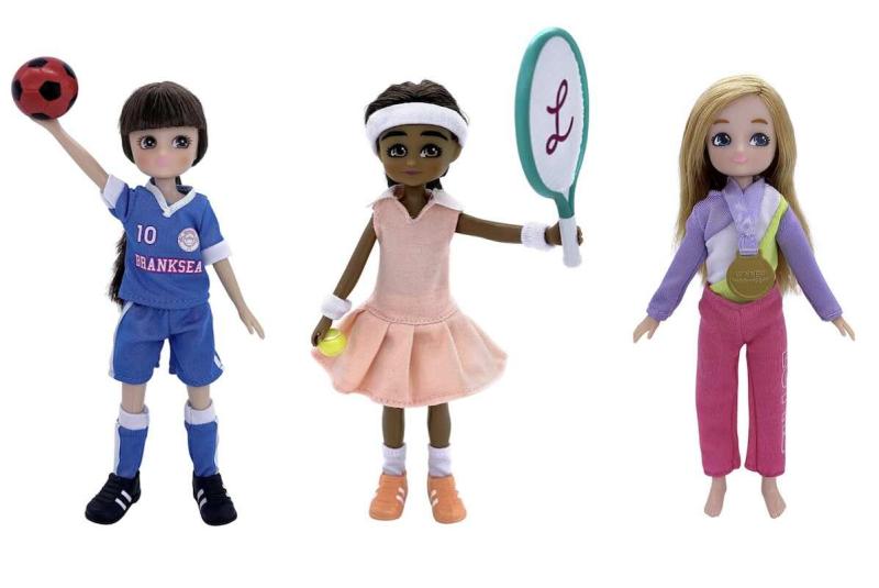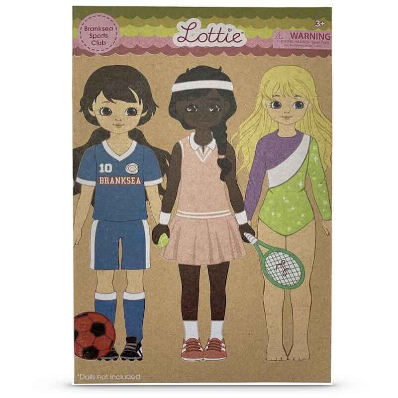 Sportigt klädset för Lottie och hennes kompisar, med tre kompletta set med kläder och utrustning för fotboll, tennis och gymnastik: Ett blå-vitt fotbolls ställ med tröja, shorts, strumpor, svarta fotbollsskor och en fotboll; ett aprikos-rosa tennis ställ med kjol, riktigt kortärmad tröja, pannband, handledsband, strumpor, tennisskor, tennisracket och tennisboll, samt ett snyggt gymnastik set med en gymnastikdräkt i lila, vitt och ljusgrönt, rosa mjukisbyxor så att Lottie inte blir kall medan hon väntar på sin tur och en stor guldmedalj att vinna och hänga runt halsen på dockan.