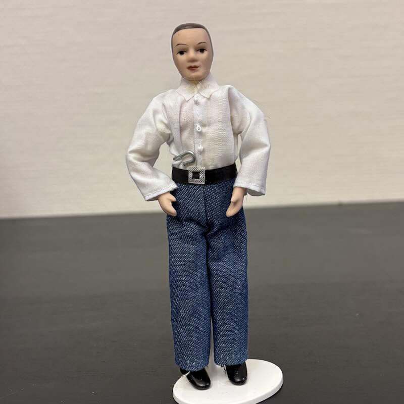 Man pappa herre i porslin med handmålat ansikte och böjbara leder. Klädd i jeans, skjorta och väst. Mått ca 15 cm
