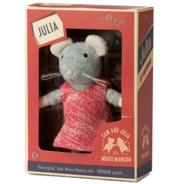Charmiga Julia är en mjuk mus-docka, 12 cm lång som bor i sitt Mouse Mansion. Det finns även möbler i serien som du sätter samman själv. Mössen kan bo i vanliga dockhus i skala 1:12, eller så bygger du själv deras hus! Passar både stora och små, utmärkt som gemensamt projekt.