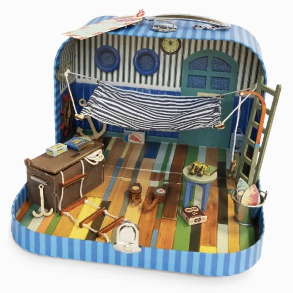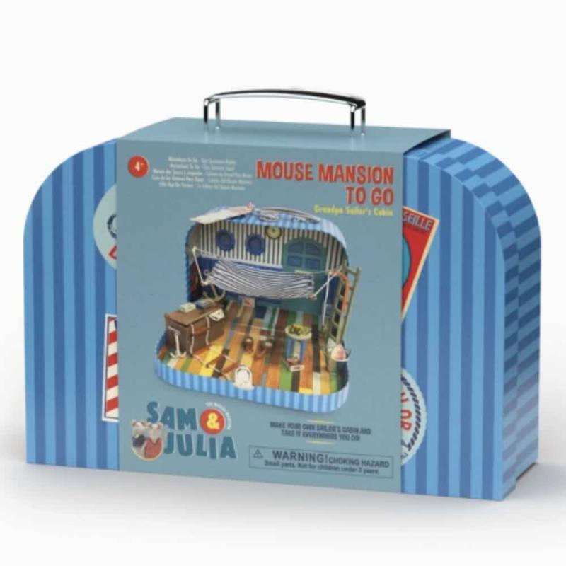 Ta med Farfar Sjöman (Grandpa Sailor) överallt i denna roliga resväska. Självklart monterar du kabinen själv - med hjälp av trädelarna och dekorationerna. Resväskan är tryckt med tapeter och ett golv. Det är bara att sätta ihop möblerna och måla dem i dina favoritfärger (färg ingår ej). Dessutom flera fina små detaljer. Denna väska är designad av Karina Schaapman, skaparen av Mouse Mansion och serien Sam och Julia på SVT barnkanalen