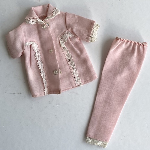 Rosa pyamas med byxor och jacka i fint skick med spetsdekor i vitt från 1960-talet, har tag "Made in Hong Kong". Passar Barbie, Sindy o Petra m fl vintage fashion dolls med smala höfter.