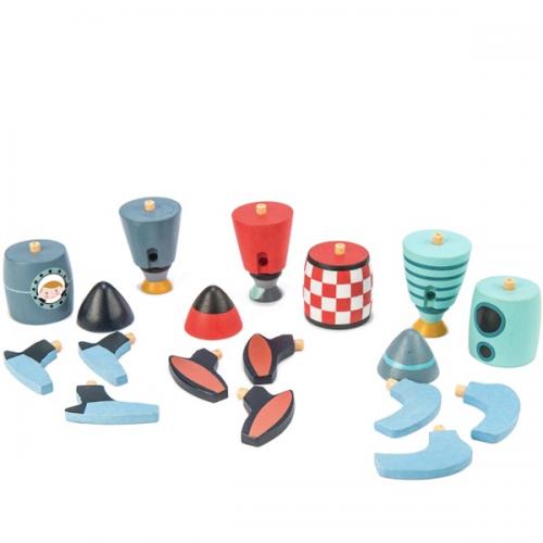 Superfint lekset med 3 raketer i trä. Varje raket består av sex bitar. Plocka isär dem och sätt ihop dem igen och skapa dina egna favoritraketer! Sedan är det bara att påbörja nedräkningen och flyga iväg. Mått varje raket ca 7 x 6,5 x 13,5 cm. Passar från 3 år pga små delar. Här nedan ser du raketernas alla delar: