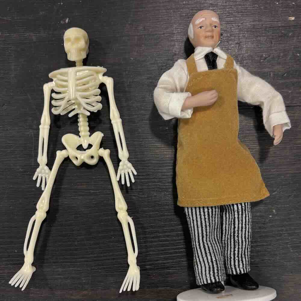 Skelett i plast, perfekt för läkarmottagningar, lärosalar eller Halloween-projekt! Mått skelettet ca H 14,5 cm. Docka med förkläde ingår ej.