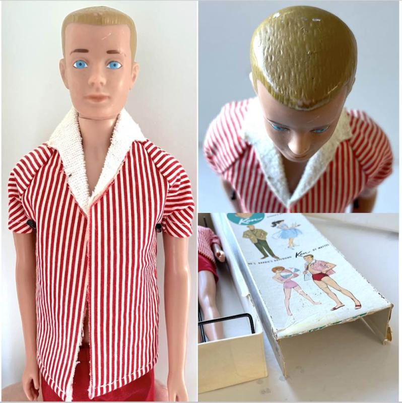 Stilig straight leg Ken (SL Ken) blond #750 från 1963. I fint lekt skick. Inga skav på ansiktsmålning men två mindre vita fläckar bak på hjässan. Kommer i originalkläder (ej sandaler) och svart ställ, + ask (nederdelen på locket saknas - se bild).